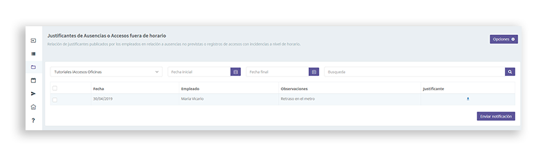 El módulo de justificantes permite gestionar los documentos aportados por los empleados para justificar las incidencias, ya sean de retraso o ausencia. En la mayoría de los casos se asume que el registro de justificantes es realizado por el propio empleado desde su zona privada, sin embargo, el responsable o supervisor también puede realizar la publicación de un justificante desde este apartado.
